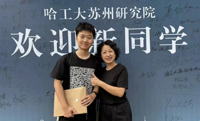 A student and his mother pose for a photo at HIT’s Suzhou Research Institute. [Photo/WeChat account of Harbin Institute of Technology]