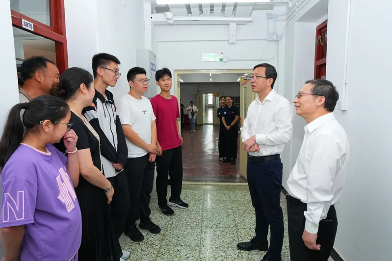 Chair of the HIT Council Chen Jie and President Han Jiecai pay a visit to students. [Photo/WeChat account of Harbin Institute of Technology]